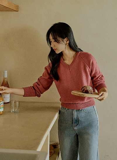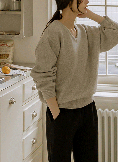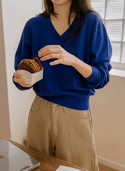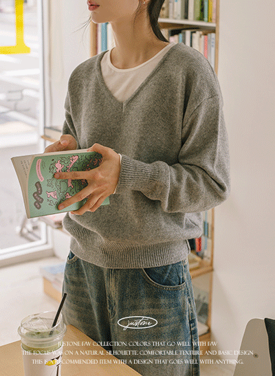 수분크림처럼 부드럽고 촉촉한 니트로 편안하게 입는 데일리템이에요~ 브이넥 디자인으로 쇄골라인이 예뻐 보이는 기본 니트랍니다 -