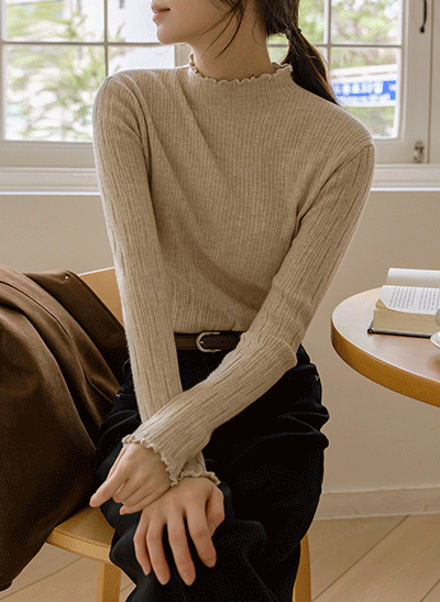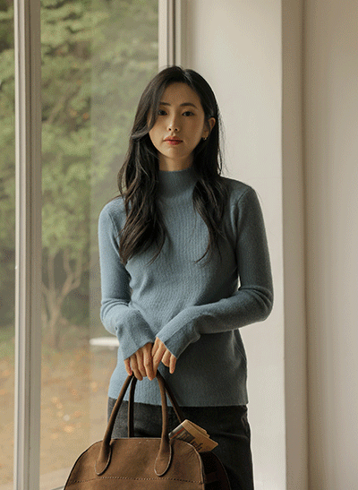 여성스러운 물결 라인이 포인트가 되어주는 반목 니트구요, 은은한 결감이 예쁜 아이템이에요 아우터 안에 이너로 입기 좋은 슬림한 니트에요! -
