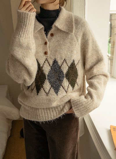 알록달록한 컬러 배색으로 사랑스러운 다이아 패턴의 니트! 어깨선이 살지 않는 나그랑 소매로 자연스럽게 떨어지는 실루엣이 예쁘구요~ 도톰한 두께로 포근하게 착용돼요 -