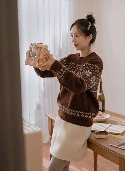 연말에 포인트 주기 좋은 눈꽃패턴이구요, 도톰한 두께로 따듯하게 입기 좋고 낙낙한 품이 군살을 커버해주어 편안하게 착용 가능한 겨울 감성이 느껴지는 니트에요 -
