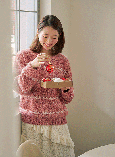 홀리데이 감성이 가득한 보카시 니트! 단가라 패턴처럼 보이는 뜨개 짜임 배색이 멋스러운 포인트가 되어주며, 넉넉한 핏으로 누구나 편안하게 입을 수 있어요~ -