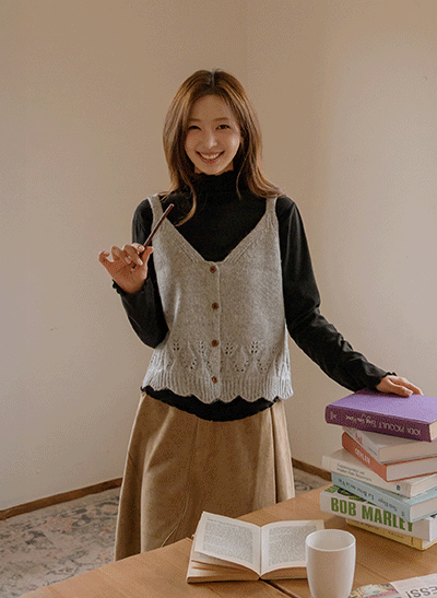 기본 티셔츠 위에 레이어드 해주시면, 러블리하고 여성스러운 데이트룩 또는 연말룩 완성! 밑단에 스캘럽 디자인이 포인트가 되어주는 뷔스티에 니트 나시에요 -