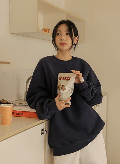 여기저기 휘뚜루 마뚜루 입기 좋은 플레인 맨투맨이구요, 안쪽에 합포안감으로 매끈한 터치감이라 먼지가 잘 달라 붙지 않아요! 루즈한 핏감으로 군살을 쏙 커버해준답니다 -