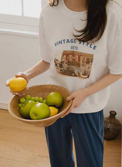 사진처럼 프린팅이 된 반팔 맨투맨으로 하나만 입어도 멋스러워요! 편안하게 입기 좋은 여유핏에 세미 크롭 기장감으로 다리가 길어 보여요 :D - 24,800원
