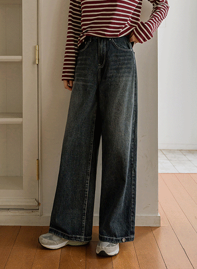 빈티지한 색감에 빠진 편안한 스판 데님이에요~ 군살 부각이 없도록 여유있게 일자로 똑- 떨어지는 와이드 핏으로 부담 없이 데일리하게 입기 좋아요! -