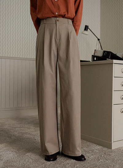 중량감 있는 탄탄한 원단으로 발끝까지 차르르하게 떨어지는 투핀턱 와이드 슬랙스! 유연한 뒷밴딩으로 허리 조임 없이 편안하게 입어지며, 탄력 좋은 스판기로 늘어짐 없이 오래오래 입을 수 있답니다~ -