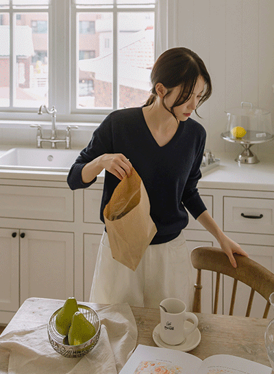 도톰한 니트에 힙을 살짝 덮어주어 부담없이 입기 좋구요, V넥 디자인으로 목 라인이 예뻐 보이는 아이템이에요 -