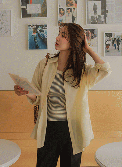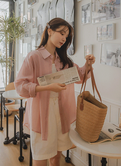 매끈한 터치가 느껴지는 썸머셔츠로 아우터로 활용해도 좋구요, 바디에 잘 달라붙지 않는 소재로 쾌적하게 입기 좋아요! 은은한 파스텔 톤으로 부담스럽지 않아요 -