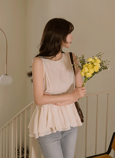 와이드한 나시 디자인과 밑단에 프릴 디테일로 노출 부담이 없으면서 뱃살을 자연스럽게 커버해주는 페플럼 블라우스에요~ 여름에 단품은 물론, 가디건을 걸쳐도 예쁜 아이템이에요 -