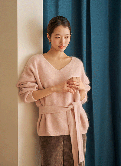 앙고라처럼 헤어감이 포근하게 올라오는 토끼털 니트로 따뜻하게 입으며, 끈이 세트로 구성되어 타이 머플러 or 허리 벨트로 활용할 수 있구요! 브이넥과 루즈핏으로 여리여리한 실루엣이 연출되어 예뻐요~ -