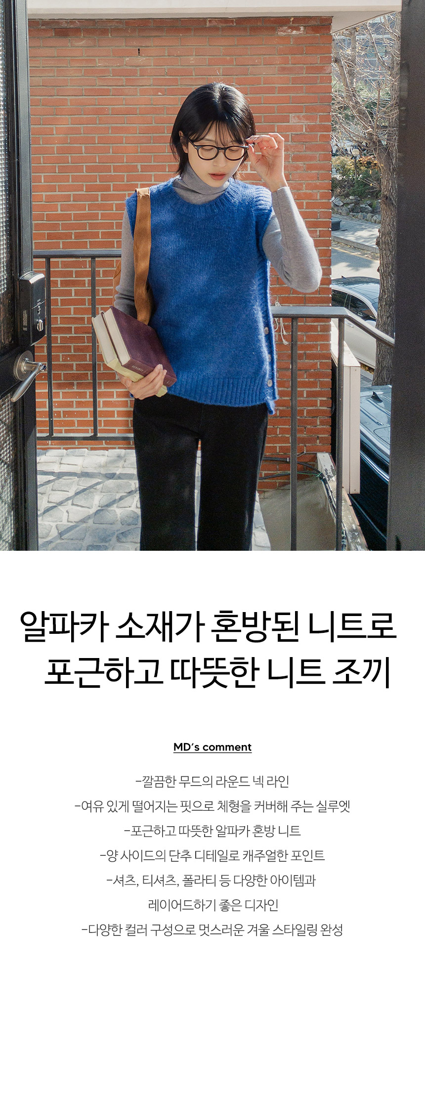 화사한 컬러구성으로 겨울 코디에 포인트가 되어주면서 알파카 혼방 소재로 더욱 포근하게 입기 좋은 아이템이에요 다양한 상의와 레이어드하기 좋은 조끼 디자인인으로 하나쯤 소장하시면 좋으실 꺼에요!