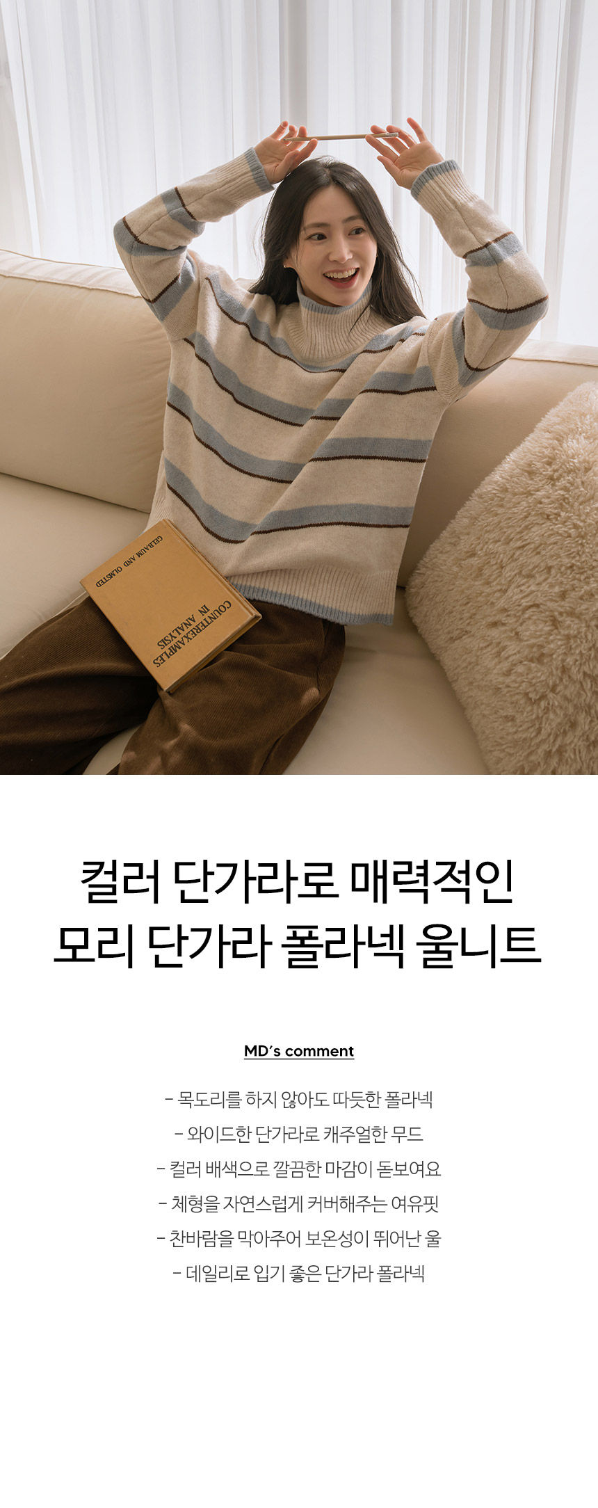 폴라넥으로 목을 따듯하게 만들어주며, 캐주얼한 단가라 패턴으로 데일리하게 입기 좋은 아이템이에요! 낙낙한 품이 군살을 커버해주어 편안하게 착용하기 좋아요