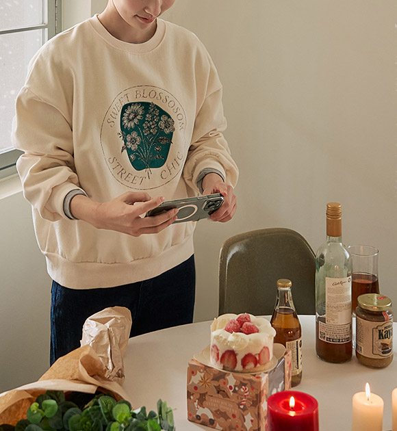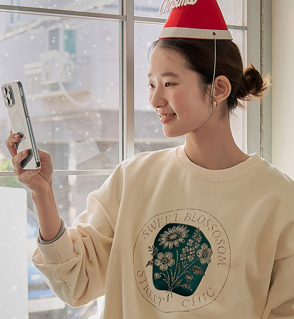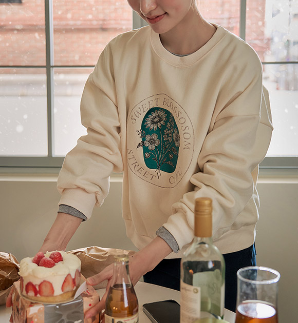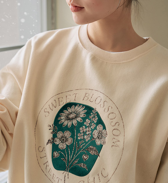페미닌 감성을 더해주는 블러썸 나염과 고급스러운 벨벳 패치가 포인트가 되어주는 캐주얼 맨투맨! 양기모 원단으로 부드러우면서 따뜻하게 착용되며, 넉넉한 핏이라 편안하게 입을 수 있어요~
