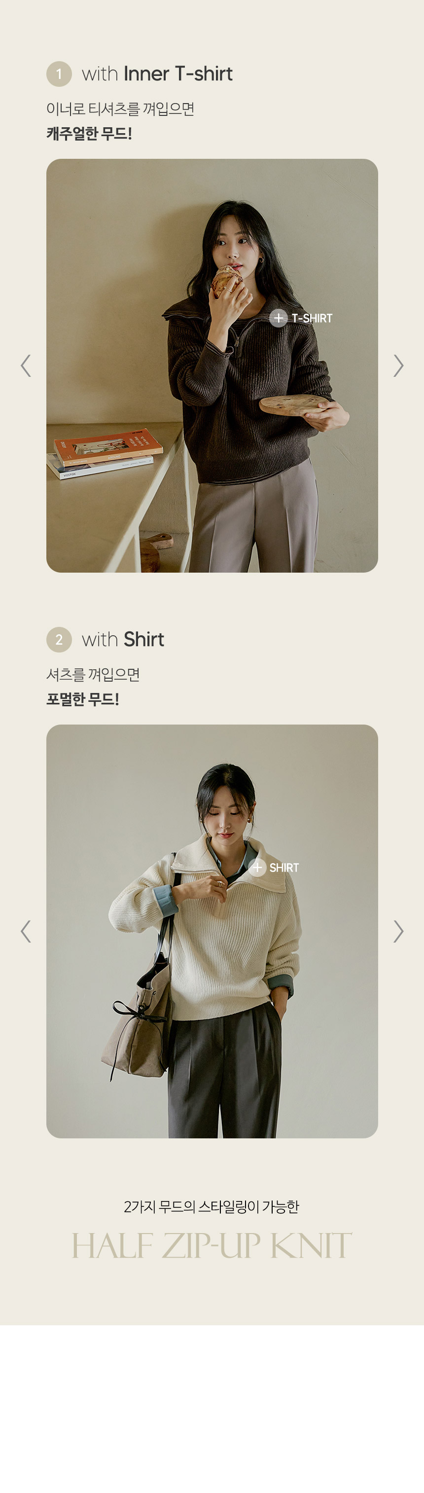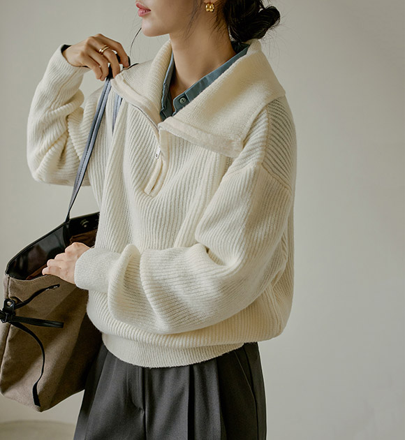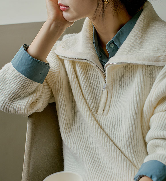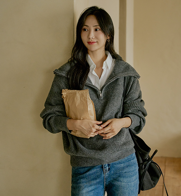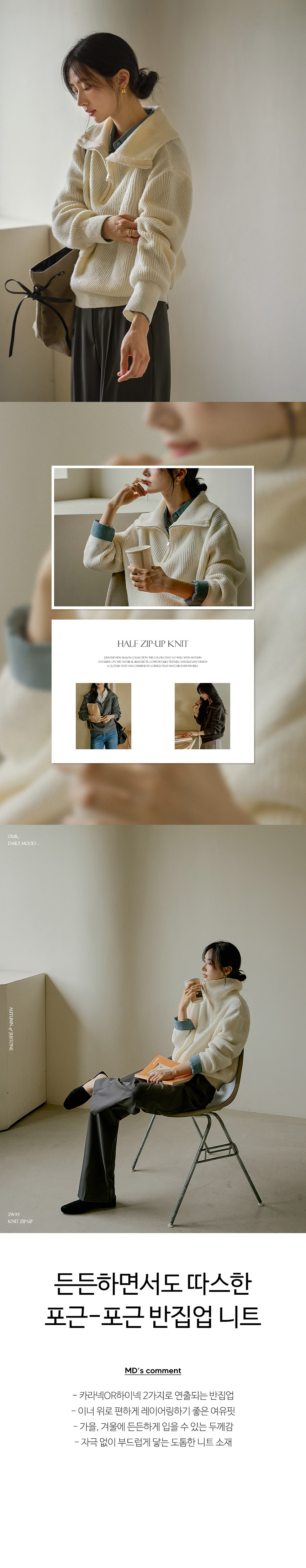 가을부터 겨울까지 활용하기 좋은 포근하면서도 든든한 반집업 니트! 다양한 이너를 껴입어 레이어링하기 좋은 여유핏이며, 까슬거림 없는 부드러운 터치로 착용감이 편안해요~