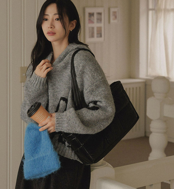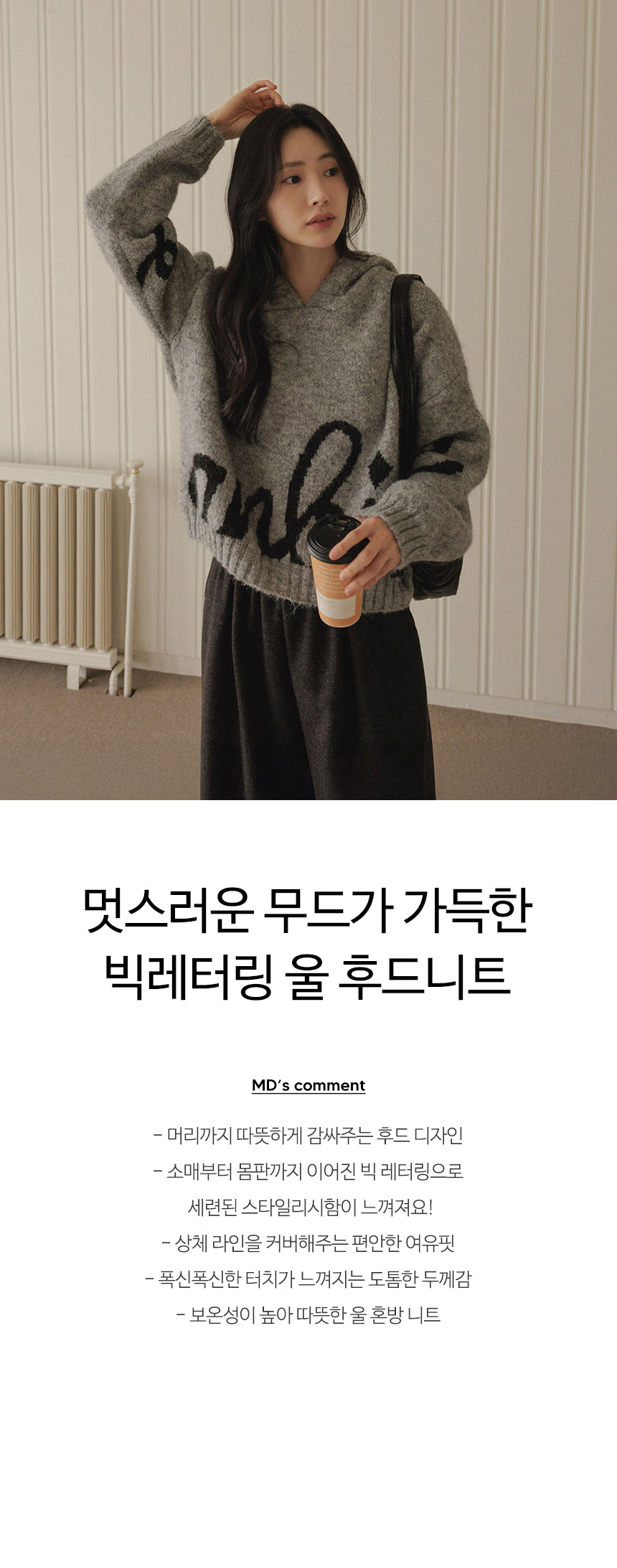소매부터 몸판까지 이어진 빅 레터링이 포인트라 멋스러운 무드가 가득한 후드 니트! 상체 라인을 커버해주는 여유핏으로 누구나 부담 없이 입기 좋으며, 울 혼방 니트로 보온성이 높아 따뜻해요~