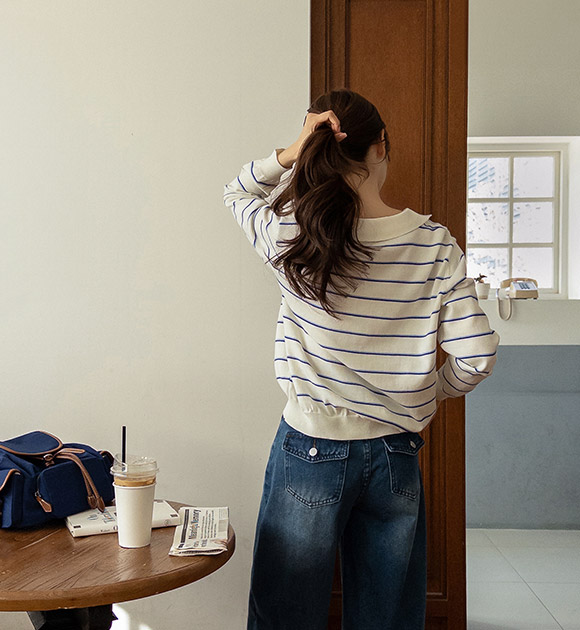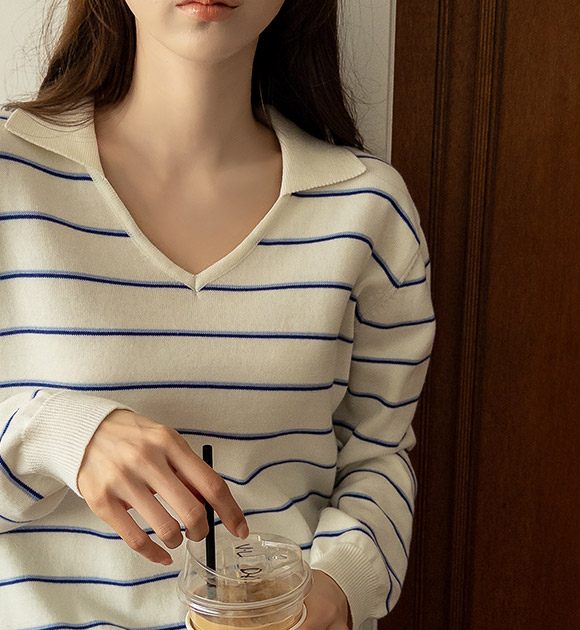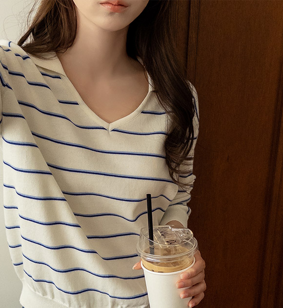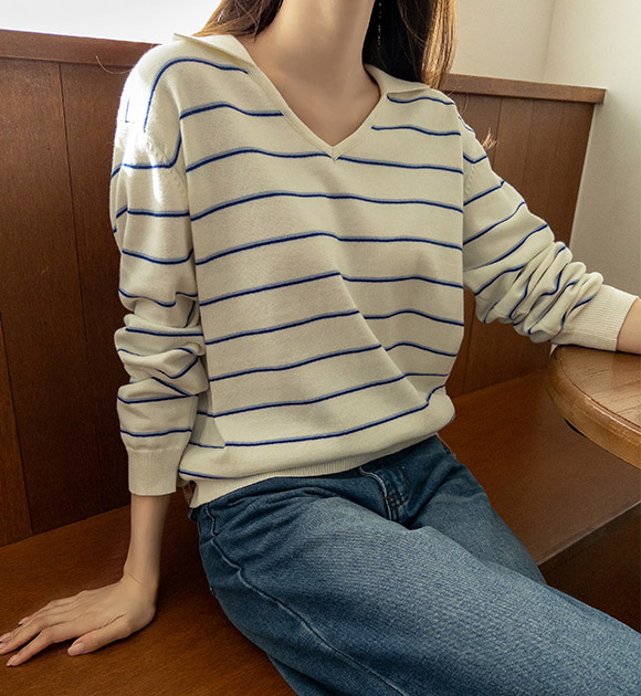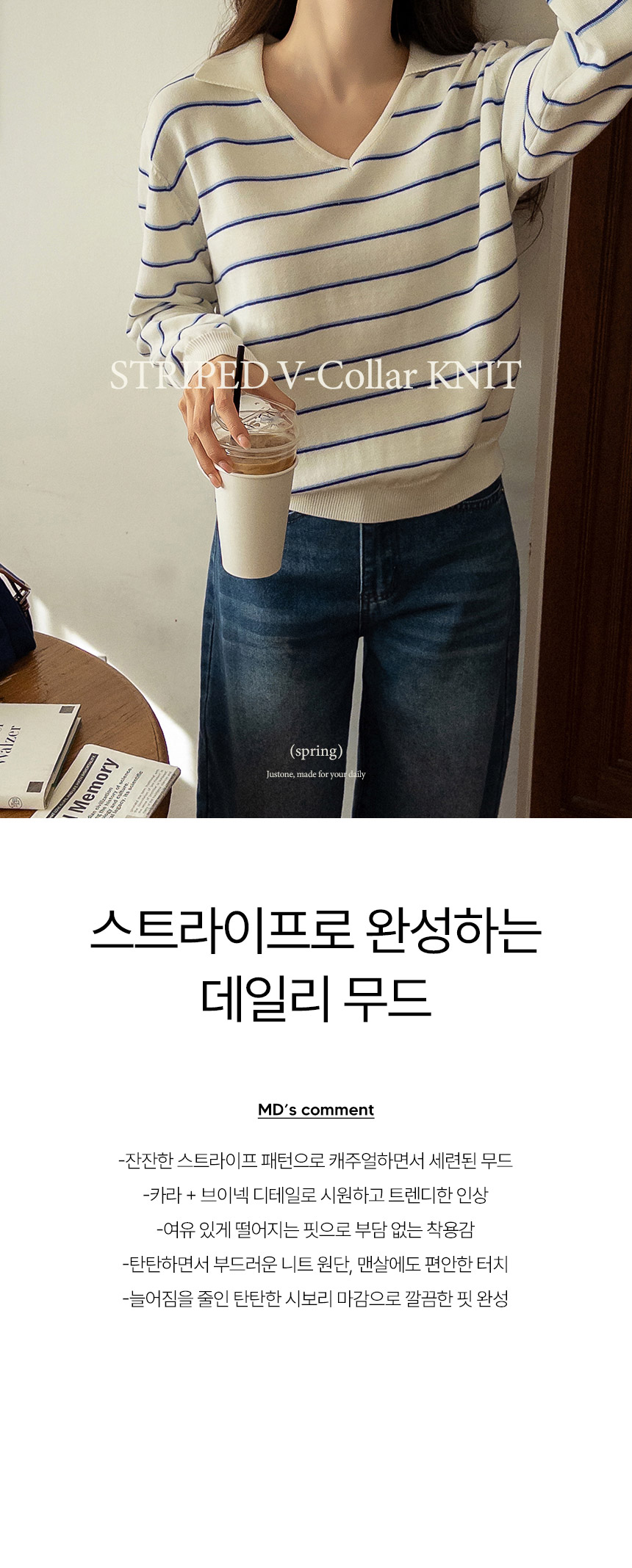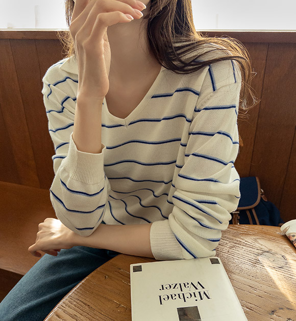 경쾌한 스트라이프 패턴과 브이 넥 카라 디자인으로 캐주얼하면서도 트렌디한 무드를 더한 니트에요! 간절기 시즌 가볍게 포인트 주기 좋은 아이템이에요