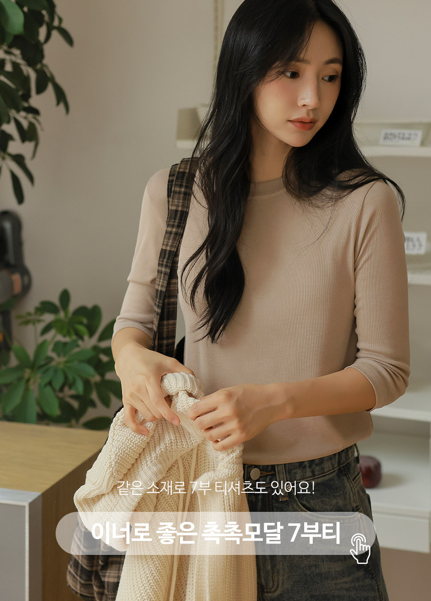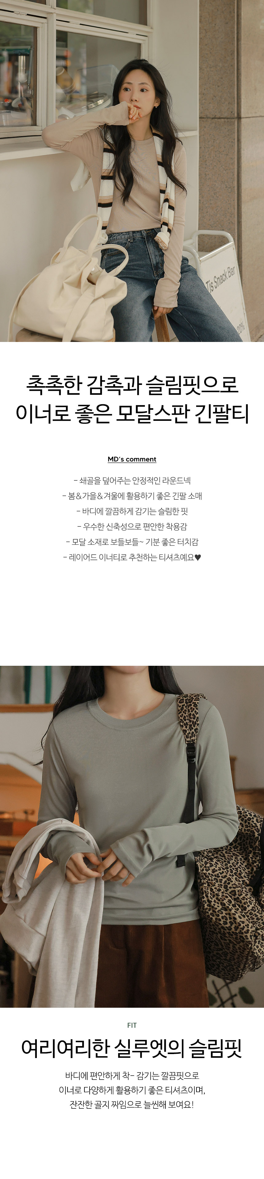 이너로 추천하는 긴팔 티셔츠! 모달과 스판이 혼방된 가벼운 원단으로 터치감이 촉촉하고 신축성이 뛰어나 편안한 착용감을 제공하며, 바디에 깔끔하게 감기는 핏으로 다양한 상의 안에 껴입기 좋아요~