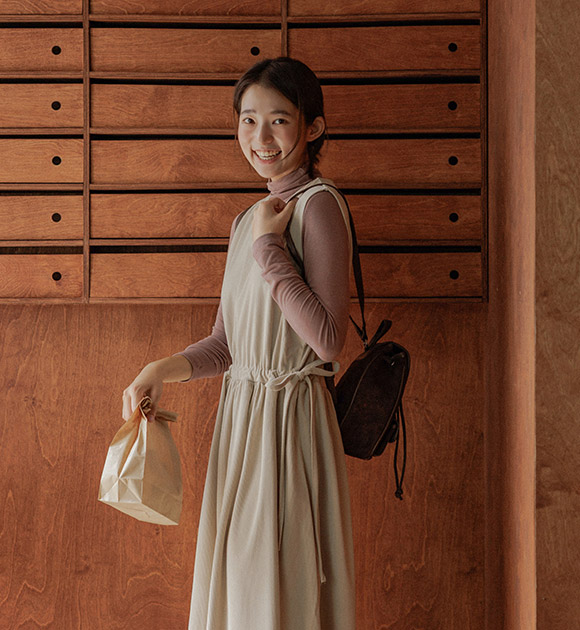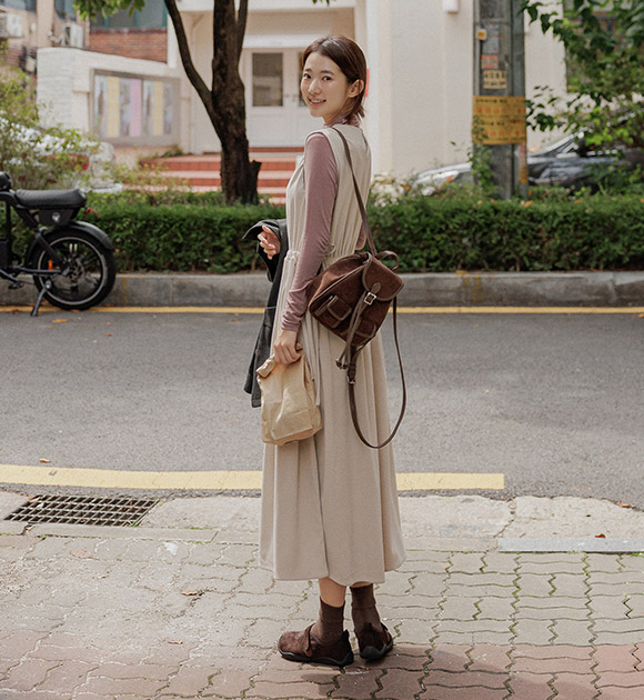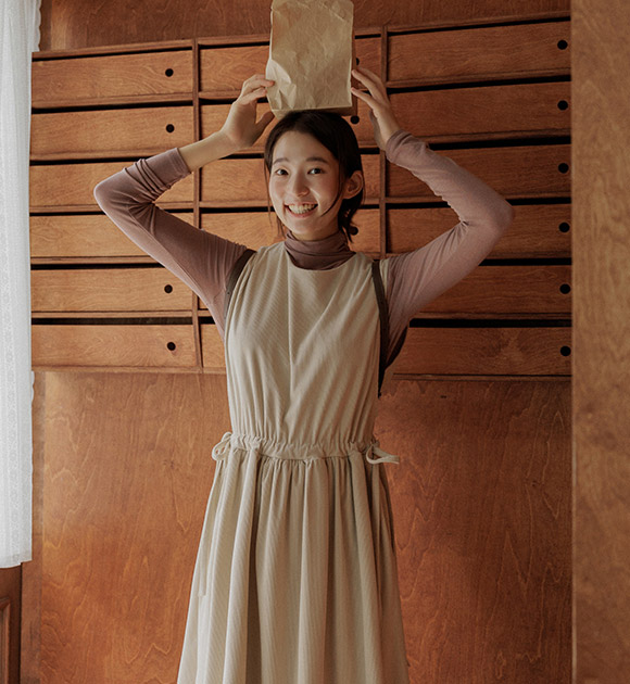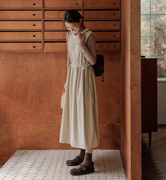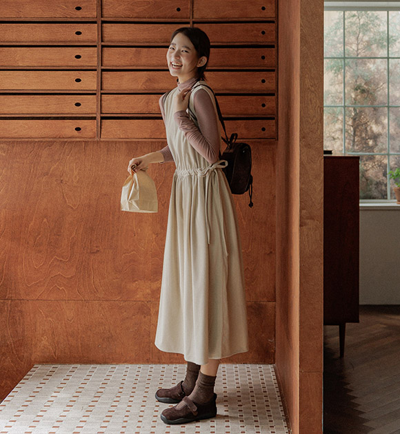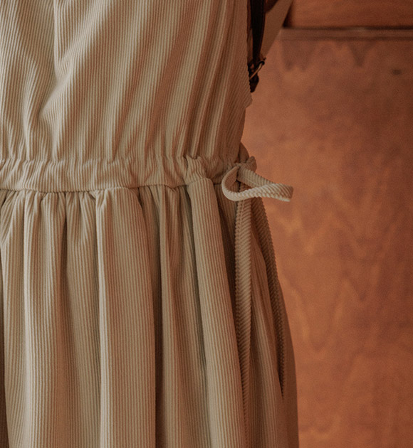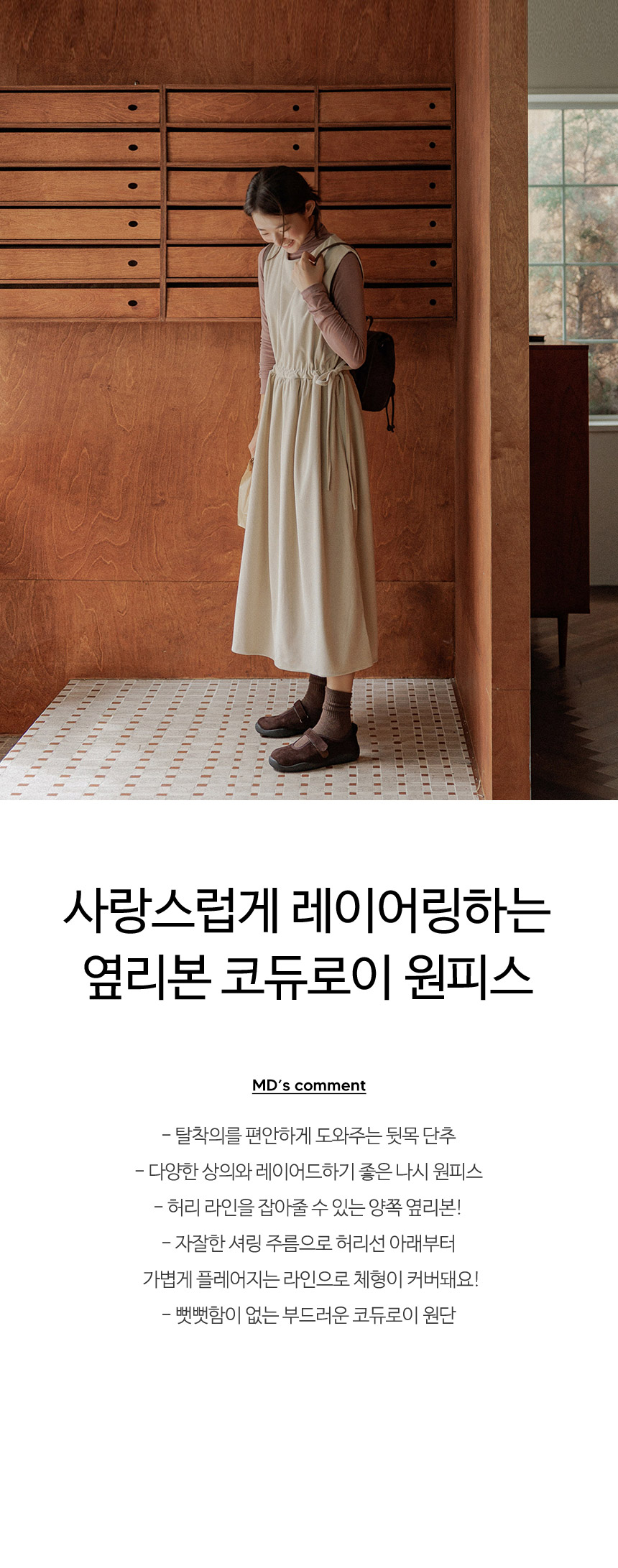 다양한 상의와 레이어링하기 좋은 나시 원피스이며, 부드러운 코듀로이 원단으로 따뜻하게 입을 수 있구요~ 양쪽 리본으로 핏 조절을 하여 여성스러운 라인감을 연출할 수 있답니다!